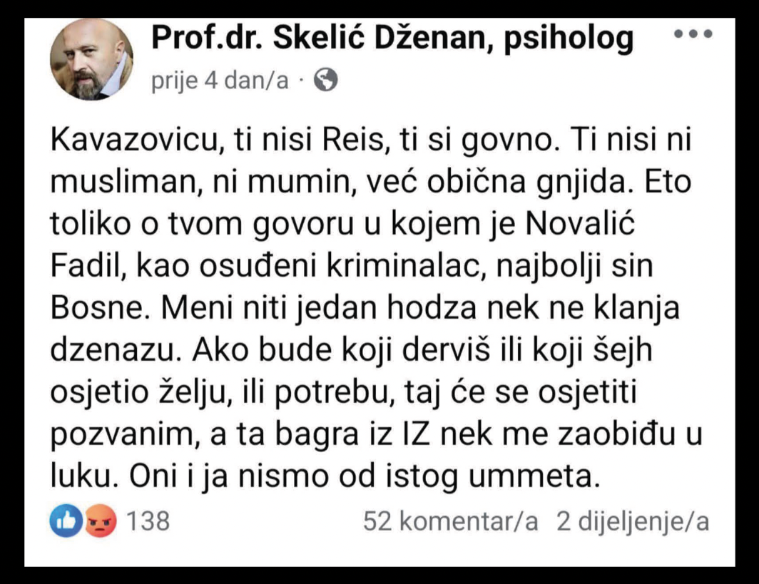 U društvu koje pokušava održati krhku ravnotežu između slobode mišljenja i kulture javnog govora, profesor bi trebao biti onaj koji tu ravnotežu čuva, a ne ruši. Kada se univerzitetski profesor spusti na nivo vulgarnosti i dopusti sebi da vjerskog poglavara, Reisa, naziva vulgarno, tada ne svjedočimo slobodi misli, nego eroziju akademskog morala. Ja, kao univerzitetski profesor, zgrozio sam se i stidim se da se jedan univerzitetski profesor tako izražava. On nije ponizio samo sebe, nego ponizio sve nas i ponizio čitavu akademsku zajednicu.