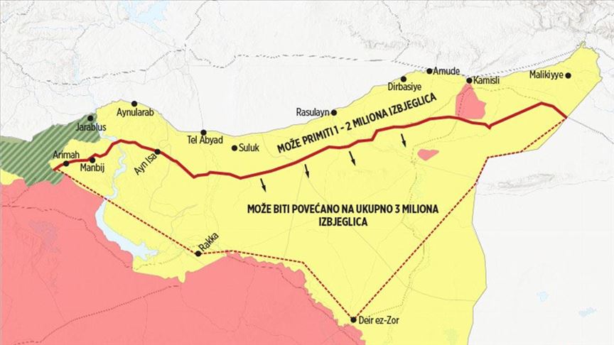 Sigurna zona koju je predložila Turska, a koja bi se prostirala duž linije od 480 kilometara, mogla bi biti dom za do tri miliona Sirijaca, javlja Anadolu Agency (AA).